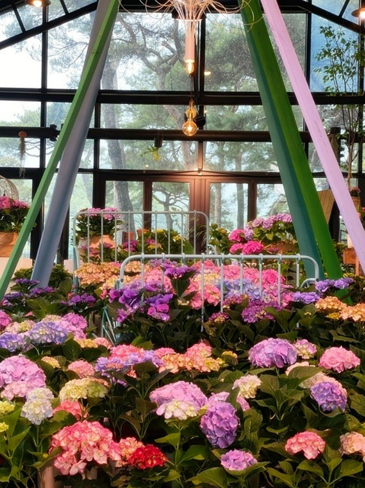수국으로 둘째 가라면 아쉬운 지역, 제주. 3월부터 6월 12일까지 이어지는 휴애리 수국축제는 정성스럽게 키운 다양한 수국을 온실, 수국정원, 수국오름 등 공원 곳곳에서 감상할 수 있어 인기가 좋다. 공원에 진입한 이후부터 나오는 출구까지 전체가 수국으로 덮여 있어 전체가 포토 스팟. 특히 제주 전통집의 포토 프레임 같은 창으로 보이는 수국 밭 절경은 놓치지 말 것. 웨딩스냅, 우정스냅으로도 유명한 스팟이라고 하니 이 기회에 인생샷 꼭 남겨보도록 하자.