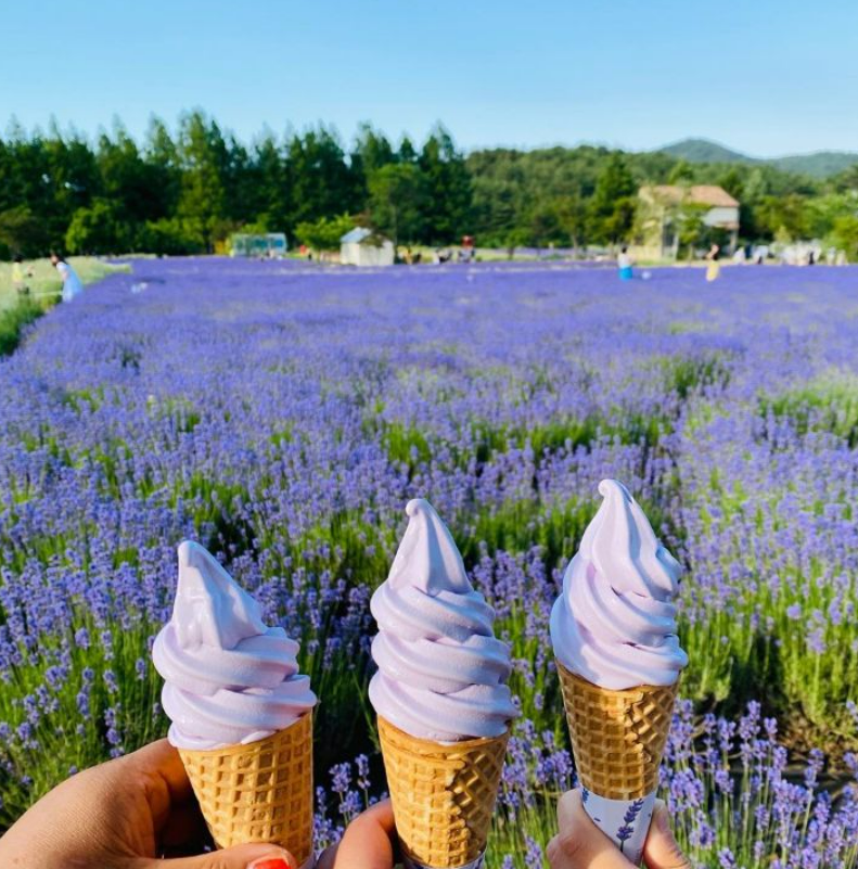 라벤더 꽃밭에서 보랏빛 라벤더 아이스크림은 필수! 꽃을 배경으로 남기는 귀여운 인증샷이 가능하다.