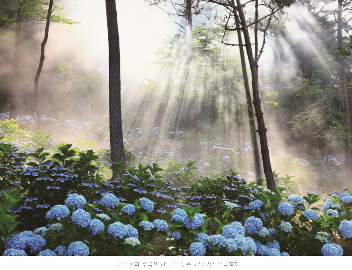 전남 해남 두륜산 서쪽 골짜기를 색색으로 수놓는 해남 땅끝수국축제는 여름 휴가를 위한 최고의 선택이다.