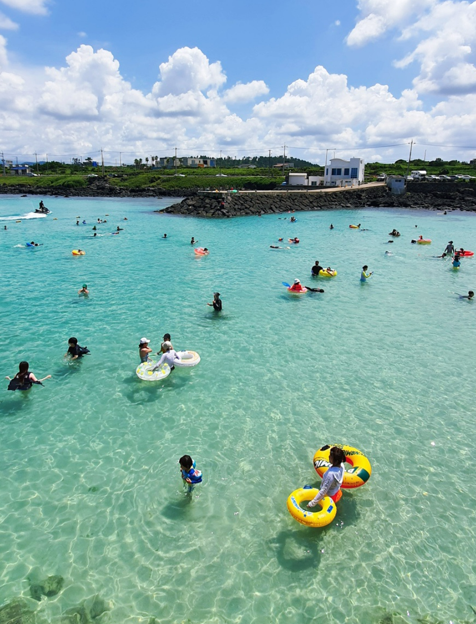 제주 서쪽의 다른 해수욕장에 비해 물이 깊지 않아서, 어른이나 물을 무서워하지 않는 여행자에게 적합해요.