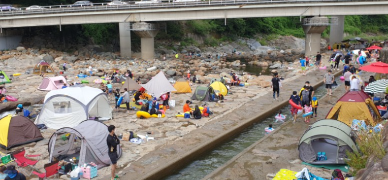 통영대전 고속도로 단성 IC를 나와 이곳 삼장교까지 오는 도중에도 산청에는 좋은 계곡이 많습니다.하지만 이렇게 사람이 붐비고 축제가 열리는 듯한 풍경은 볼 수가 없었는데 삼장교 자연유수풀이 인기 있는 장소임에는 틀림없습니다. 아무래도 SNS로 유명해지다보니 더더욱 인기 유명 여름 피서지가 된게 아닐까 한다.