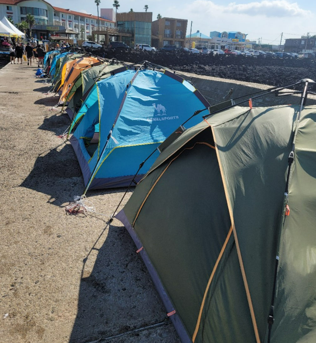 방파제에 텐트들이 있는데 이것 또한 대여할 수 있다고 한다. 종일 텐트 대여시 돗자리 포함하여 30,000원이다. 텐트 문의하거나 빌리는 사람들이 꽤 많았다. 그만큼 판포포구가 좋다는 말이 아닐까?