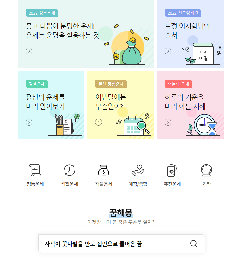 오늘의 운세, 주간 운세, 월간 운세, 평생 사주등 볼 수 있어 심심할 때 한 번쯤 보면 재미있을 듯합니다.