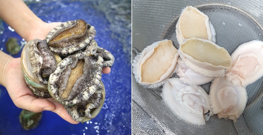 1. 물로 2~3번 헹구고 솔로 전복살의 표면을 문질러 씻습니다.