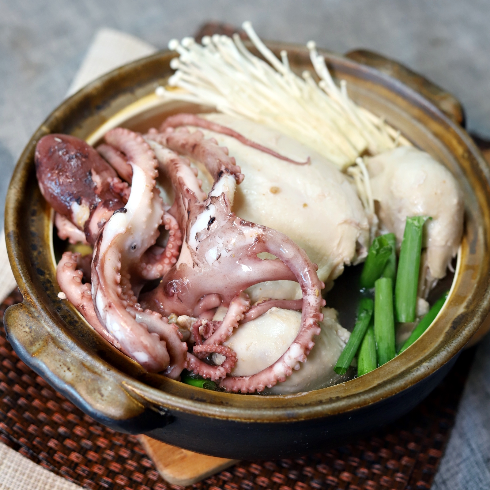 여섯째 준비한 육수와 손질한 닭을 넣고, 육수 팩과 소주를 넣고 닭이 잠길 정도로 물을 부은 뒤 쎈불로 끓여준다.