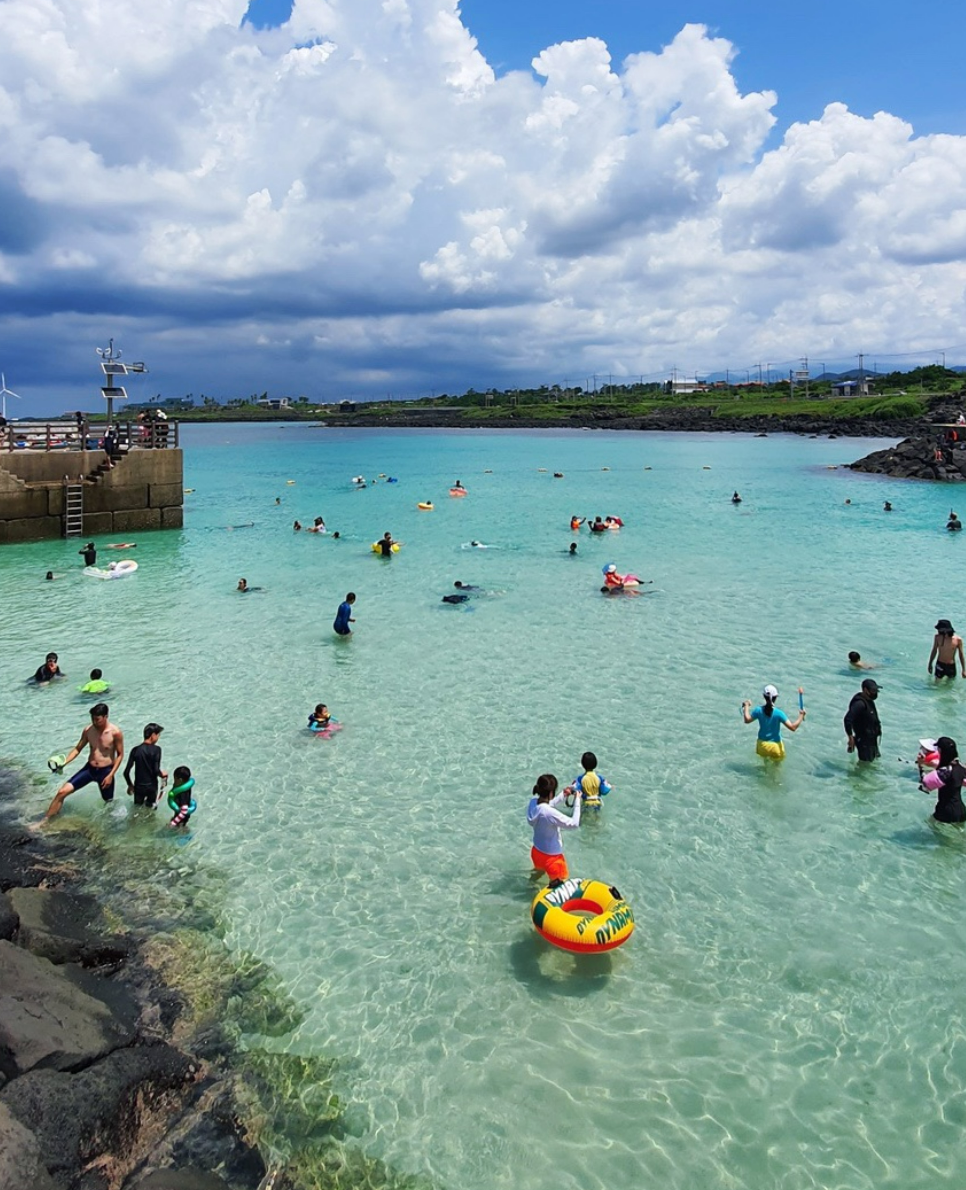 제주 서쪽의 다른 해수욕장에 비해 물이 깊지 않아서, 어른이나 물을 무서워하지 않는 여행자에게 적합해요.